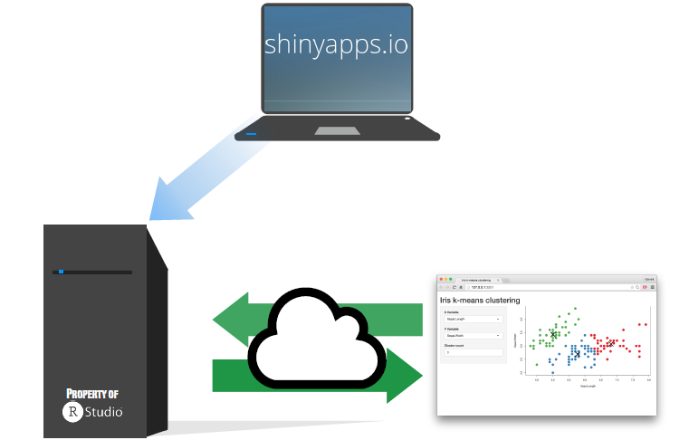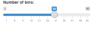 class: center, middle, inverse, title-slide # R Shiny Part I ## Programming for Statistical Science ### Shawn Santo --- ## Supplementary materials Full video lecture available in Zoom Cloud Recordings Additional resources - Shiny [documentation](http://shiny.rstudio.com/) - Shiny [Widgets Gallery](http://shiny.rstudio.com/gallery/widget-gallery.html) - Shiny [Cheat Sheet](https://github.com/rstudio/cheatsheets/raw/master/shiny.pdf) --- ## What is Shiny? .pull-left[ - Shiny is an R package. <br/><br/> - Build web-based apps with R in RStudio. <br/><br/> - Shiny can incorporate CSS themes and JavaScript actions. ] .pull-right[  ] --- ## How does Shiny work?  --- ## How does Shiny work?  --- ## How does Shiny work?  --- ## Getting started - Open RStudio - Run `install.packages("shiny")`, if needed - Go to File `>` New File `>` Shiny Web App - Enter your application's name - Keep option Single File (app.R) selected - Enter the directory of where the application should be saved - File `app.R` should open, click Run App to see the result --- ## Main components of RShiny .pull-left[ ```r # Load package shiny library(shiny) # Define UI for application ui <- fluidPage( ) # Define server logic server <- function(input, output) { } # Build and run the application shinyApp(ui = ui, server = server) ``` ] .pull-right[ - Function `fluidPage()` creates a dynamic HTML user interface you see when you look at an RShiny app. Convention is to save this as an object named `ui`. - Function `server()` is user-defined and contains R commands your computer or external server need to run the app. - Function `shinyApp()` builds the app based on the user interface and server pair of code. ] --- ## Available examples Enter any of the following in your Console to see the Shiny app in action along with the code. ```r runExample("01_hello") # a histogram runExample("02_text") # tables and data frames runExample("03_reactivity") # a reactive expression runExample("04_mpg") # global variables runExample("05_sliders") # slider bars runExample("06_tabsets") # tabbed panels runExample("07_widgets") # help text and submit buttons runExample("08_html") # Shiny app built from HTML runExample("09_upload") # file upload wizard runExample("10_download") # file download wizard runExample("11_timer") # an automated timer ``` --- class: inverse, center, middle # User interface --- class: inverse, center, middle # User interface: inputs --- ## Input widgets  ---  --- ## Adding an input widget Most input widgets are set-up as `*Input(inputId, label, ...)` or `*Button(inputId, label, ...)`, where * is replaced with the widget's name. For example, to create a slider widget we can write ```r sliderInput(inputId = "bins", label = "Number of bins:", min = 1, max = 50, value = 30) ``` <br/><br/> Typically, the first two widget function argument names are not specified since most widgets first take an `inputId` and `label`. Argument `inputId` is where you specify a name for the widget (this is not seen by the user); argument `label` is the label that will appear in your app (this will be seen by the user). --- ## What do these widget functions return? ```r sliderInput(inputId = "bins", label = "Number of bins:", min = 1, max = 50, value = 30) ``` <br/><br/> ```html <div class="form-group shiny-input-container"> <label class="control-label" for="bins">Number of bins:</label> <input class="js-range-slider" id="bins" data-min="1" data-max="50" data-from="30" data-step="1" data-grid="true" data-grid-num="9.8" data-grid-snap="false" data-prettify-separator="," data-prettify-enabled="true" data-keyboard="true" data-data-type="number"/> </div> ``` <br/><br/> Some HTML! --- ## Assortment of input widgets .pull-left[ .tiny[ ```r ui <- fluidPage( # add slider sliderInput("bins", "Number of bins:", min = 1, max = 50, value = 30) ) server <- function(input, output) { } shinyApp(ui = ui, server = server) ``` ] ] .pull-right[  ] --- ## Assortment of input widgets .pull-left[ .tiny[ ```r ui <- fluidPage( # add slider sliderInput("bins", "Number of bins:", min = 1, max = 50, value = 30), # text box input textInput("title", "Histogram title", value = "Histogram") ) server <- function(input, output) { } shinyApp(ui = ui, server = server) ``` ] ] .pull-right[  ] --- ## Assortment of input widgets .pull-left[ .tiny[ ```r ui <- fluidPage( # add slider sliderInput("bins", "Number of bins:", min = 1, max = 50, value = 30), # text box input textInput("title", "Histogram title", value = "Histogram"), # combo box selectInput("color", "Histogram fill", choices = c("Red", "White", "Blue"), selected = "Red") ) server <- function(input, output) { } shinyApp(ui = ui, server = server) ``` ] ] .pull-right[  ] -- Continue to add as many additional widgets as you want/need. --- class: inverse, center, middle # User interface: outputs --- ## Output functions Inputs are added with `*Input()`. Similarly, outputs in Shiny are added with `*Output()`. | Output function | Creates | |:----------------------:|:----------:| | `dataTableOutput()` | data table | | `htmlOutput()` | raw HTML | | `imageOutput()` | image | | `plotOutput()` | plot | | `tableOutput()` | table | | `textOutput()` | text | | `uiOutput()` | raw HTML | | `verbatimTextOutput()` | text | --- ## Output function details  <br/> The first argument for each output function is `outputId`. This argument is where you specify a name for the output (this is not seen by the user). This name will serve as reference for code in function `server()`. --- ## Output function .pull-left[ .tiny[ ```r ui <- fluidPage( # add slider sliderInput("bins", "Number of bins:", min = 1, max = 50, value = 30), plotOutput(outputId = "hist") ) server <- function(input, output) { } shinyApp(ui = ui, server = server) ``` ] ] .pull-right[  ] -- <br/><br/> Our code `plotOutput(outputId = "hist")` allocates space for a plot. We haven’t created anything yet, hence no plot is visible. --- ## What do these output functions return? ```r plotOutput(outputI