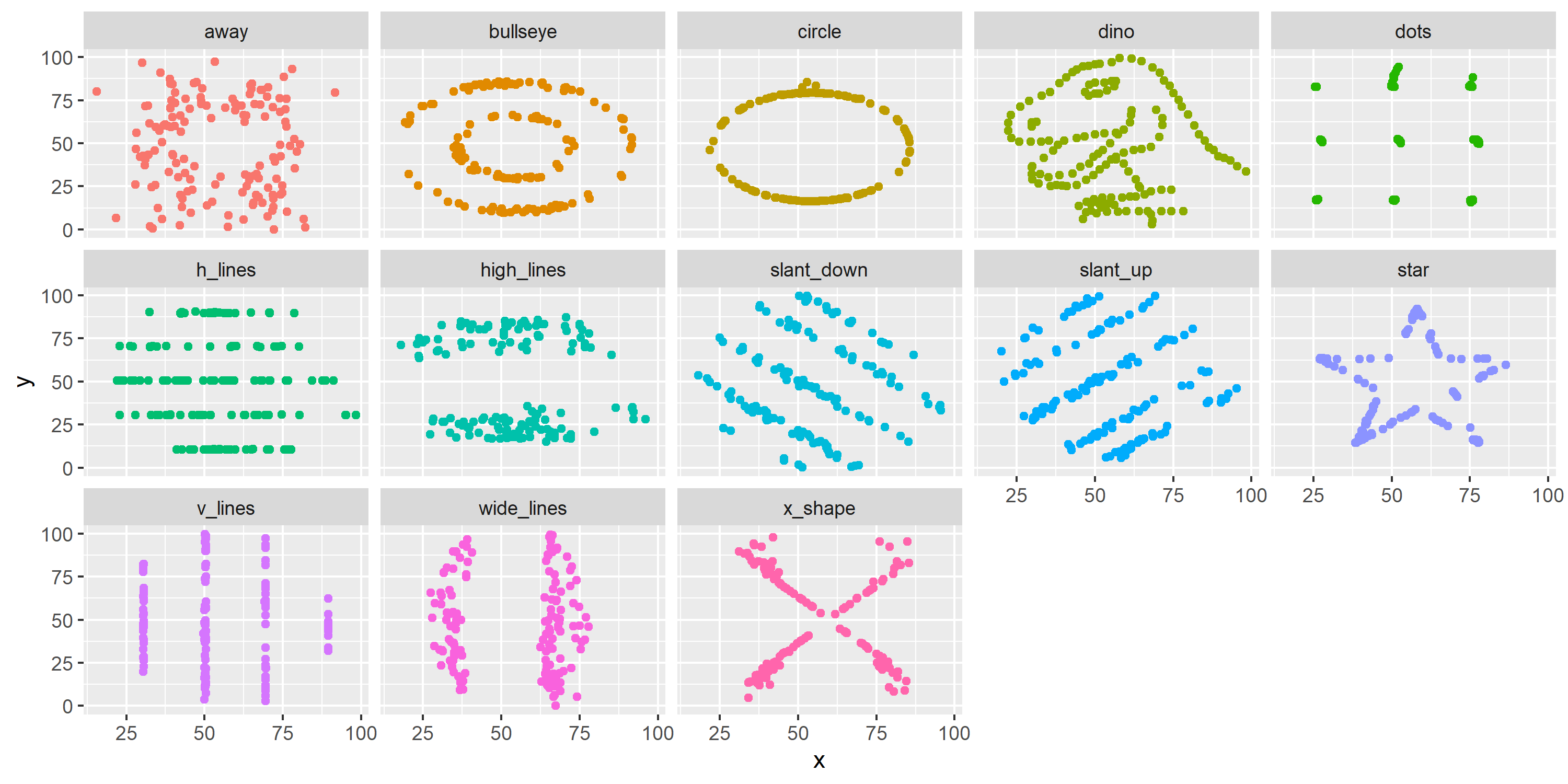 class: center, middle, inverse, title-slide # Data visualization workshop ### Yue Jiang ### Duke University / STA 583 / Spring 2023 --- ## Why do we visualize? Below is an excerpt from the `datasaurus_dozen` dataset: ``` ## # A tibble: 13 x 2 ## dataset r ## <chr> <dbl> ## 1 away -0.0641 ## 2 bullseye -0.0686 ## 3 circle -0.0683 ## 4 dino -0.0645 ## 5 dots -0.0603 ## 6 h_lines -0.0617 ## 7 high_lines -0.0685 ## 8 slant_down -0.0690 ## 9 slant_up -0.0686 ## 10 star -0.0630 ## 11 v_lines -0.0694 ## 12 wide_lines -0.0666 ## 13 x_shape -0.0656 ``` --- ## Why do we visualize? .question[ How similar do the relationships between `x` and `y` look based on the plots? Based on the summary statistics? ] <!-- --> --- ## Anscombe's quartet ```r library(Tmisc) quartet ``` .pull-left[ ``` ## set x y ## 1 I 10 8.04 ## 2 I 8 6.95 ## 3 I 13 7.58 ## 4 I 9 8.81 ## 5 I 11 8.33 ## 6 I 14 9.96 ## 7 I 6 7.24 ## 8 I 4 4.26 ## 9 I 12 10.84 ## 10 I 7 4.82 ## 11 I 5 5.68 ## 12 II 10 9.14 ## 13 II 8 8.14 ## 14 II 13 8.74 ## 15 II 9 8.77 ## 16 II 11 9.26 ## 17 II 14 8.10 ## 18 II 6 6.13 ## 19 II 4 3.10 ## 20 II 12 9.13 ## 21 II 7 7.26 ## 22 II 5 4.74 ``` ] .pull-right[ ``` ## set x y ## 23 III 10 7.46 ## 24 III 8 6.77 ## 25 III 13 12.74 ## 26 III 9 7.11 ## 27 III 11 7.81 ## 28 III 14 8.84 ## 29 III 6 6.08 ## 30 III 4 5.39 ## 31 III 12 8.15 ## 32 III 7 6.42 ## 33 III 5 5.73 ## 34 IV 8 6.58 ## 35 IV 8 5.76 ## 36 IV 8 7.71 ## 37 IV 8 8.84 ## 38 IV 8 8.47 ## 39 IV 8 7.04 ## 40 IV 8 5.25 ## 41 IV 19 12.50 ## 42 IV 8 5.56 ## 43 IV 8 7.91 ## 44 IV 8 6.89 ``` ] --- ## Summarising Anscombe's quartet ```r quartet %>% group_by(set) %>% summarise( mean_x = mean(x), mean_y = mean(y), sd_x = sd(x), sd_y = sd(y), r = cor(x, y) ) ``` ``` ## # A tibble: 4 x 6 ## set mean_x mean_y sd_x sd_y r ## <fct> <dbl> <dbl> <dbl> <dbl> <dbl> ## 1 I 9 7.50 3.32 2.03 0.816 ## 2 II 9 7.50 3.32 2.03 0.816 ## 3 III 9 7.5 3.32 2.03 0.816 ## 4 IV 9 7.50 3.32 2.03 0.817 ``` --- ## Visualizing Anscombe's quartet ```r ggplot(quartet, aes(x = x, y = y)) + geom_point() + facet_wrap(~ set, ncol = 4) ``` <!-- --> --- ## Keep it simple <img src="img/04/pie-3d.jpg" width="300" style="display: block; margin: auto;" /> <img src="lec-4_files/figure-html/pie-to-bar-1.png" width="600" style="display: block; margin: auto;" /> --- ## Use color to draw attention <img src="lec-4_files/figure-html/unnamed-chunk-1-1.png" width="500" style="display: block; margin: auto;" /> <img src="lec-4_files/figure-html/unnamed-chunk-2-1.png" width="600" style="display: block; margin: auto;" /> --- ## Tell a story <img src="img/04/time-series.story.png" width="800" style="display: block; margin: auto;" /> .footnote[ Credit: Angela Zoss and Eric Monson, Duke DVS ] --- ### Some effective visualizations [An amazing website!](http://r-statistics.co/Top50-Ggplot2-Visualizations-MasterList-R-Code.html) --- ### In-class activity